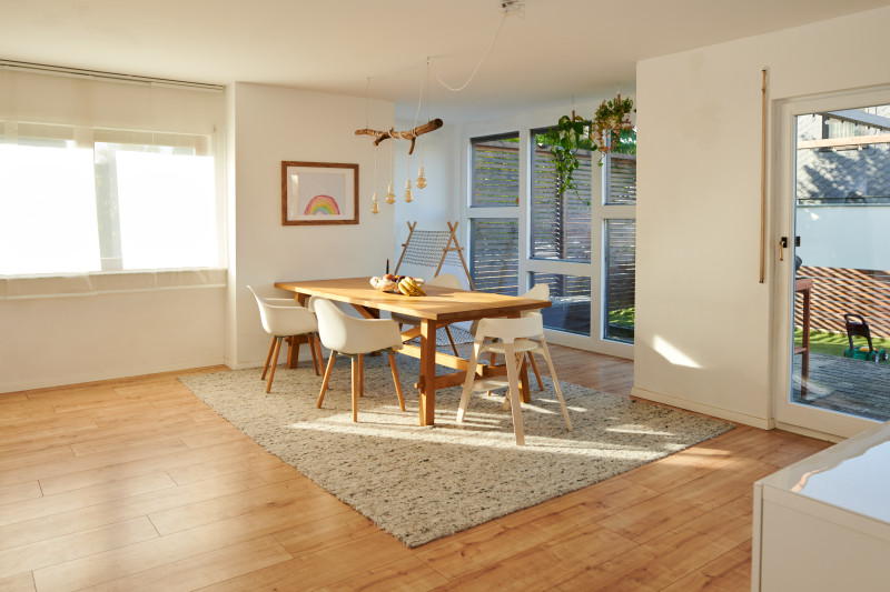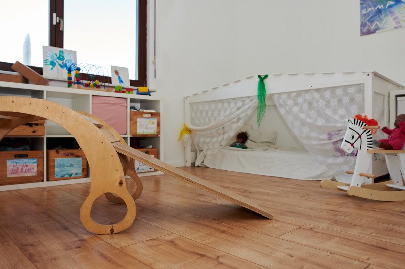 Der Spielraum ist ein kreativer Ort, an dem die Kinder mit verschiedenen Spielsachen und Materialien ihrer Fantasie freien Lauf lassen können. Vom Esszimmer aus gelangt man auf eine Terrasse, die eine direkte Verbindung zum großen Garten bietet.